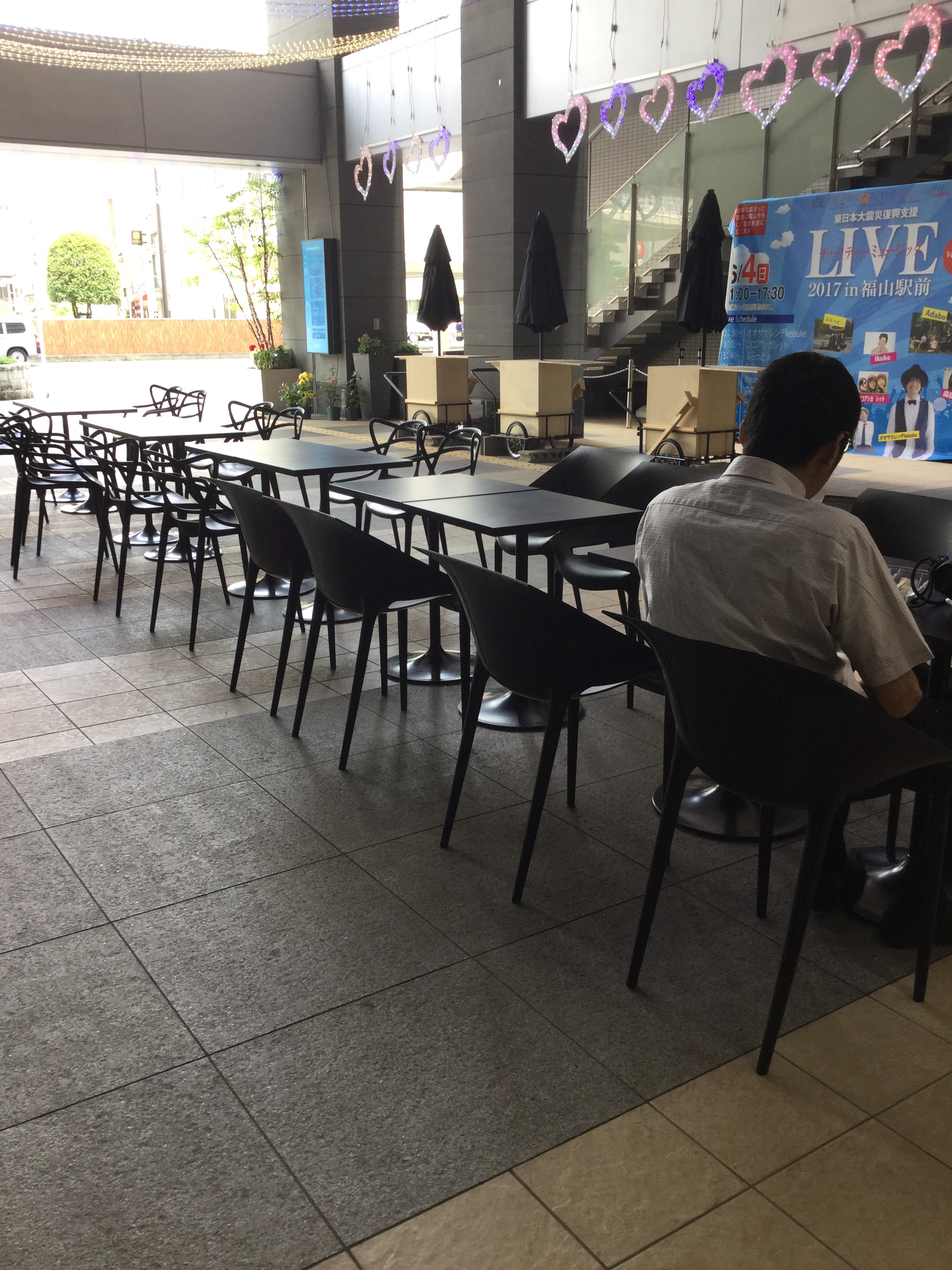 それはさておき、この「アイネスフクヤマ」というビルには、やたらと空きスペースに椅子とテーブルが置いてある。