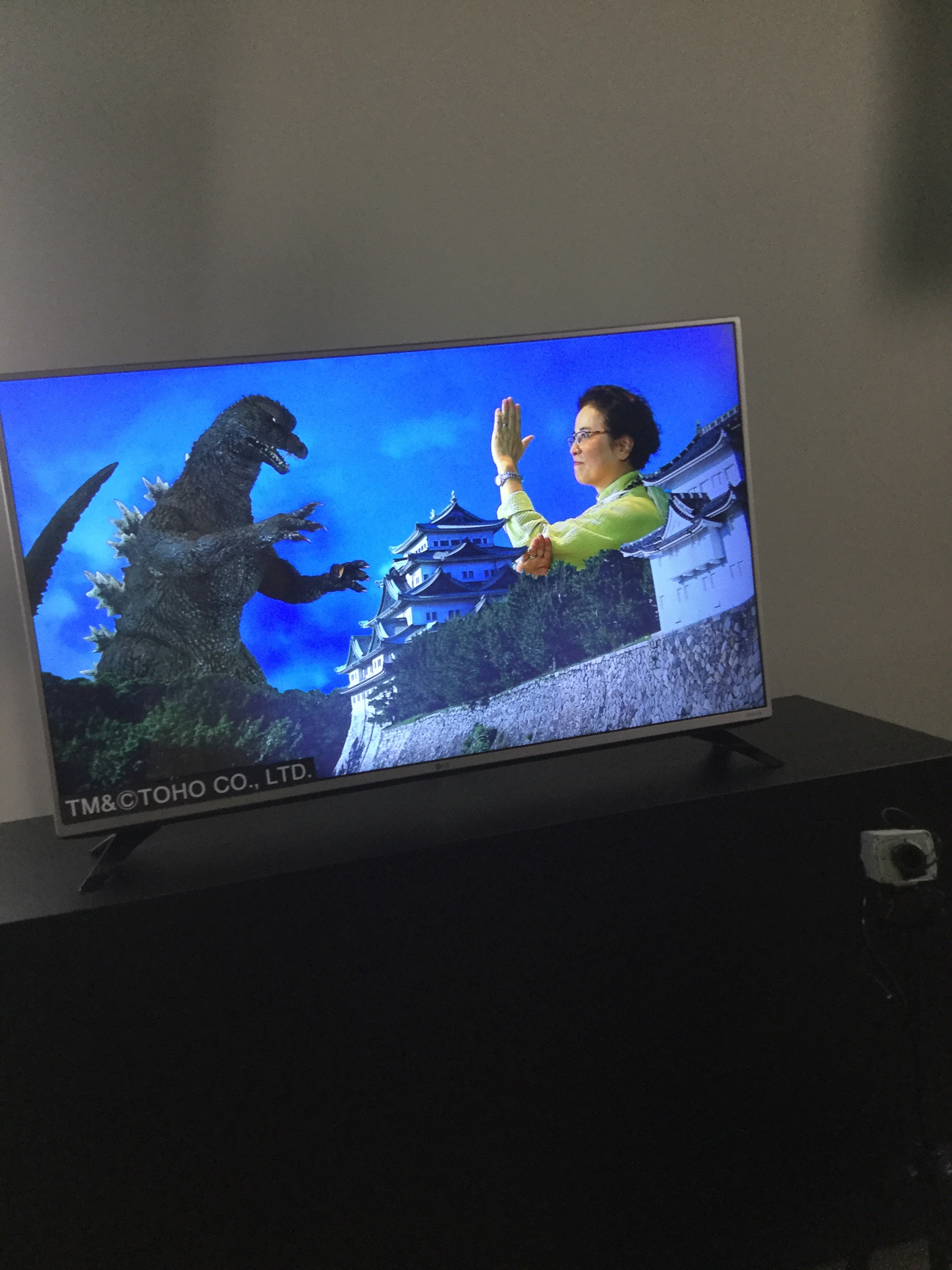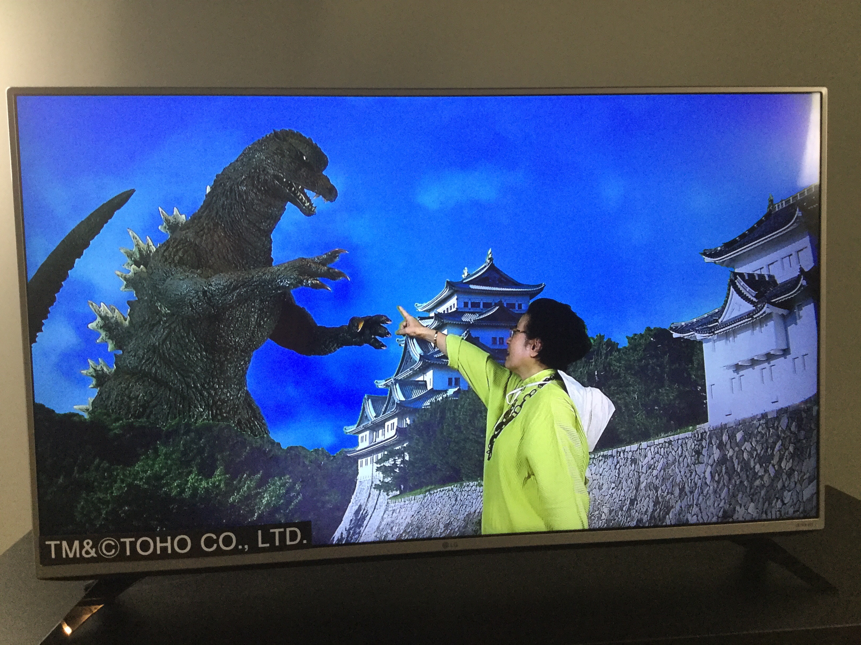 まったく、関係ない方向を指差すと、モニターには、ゴジラを指差している私が映る。