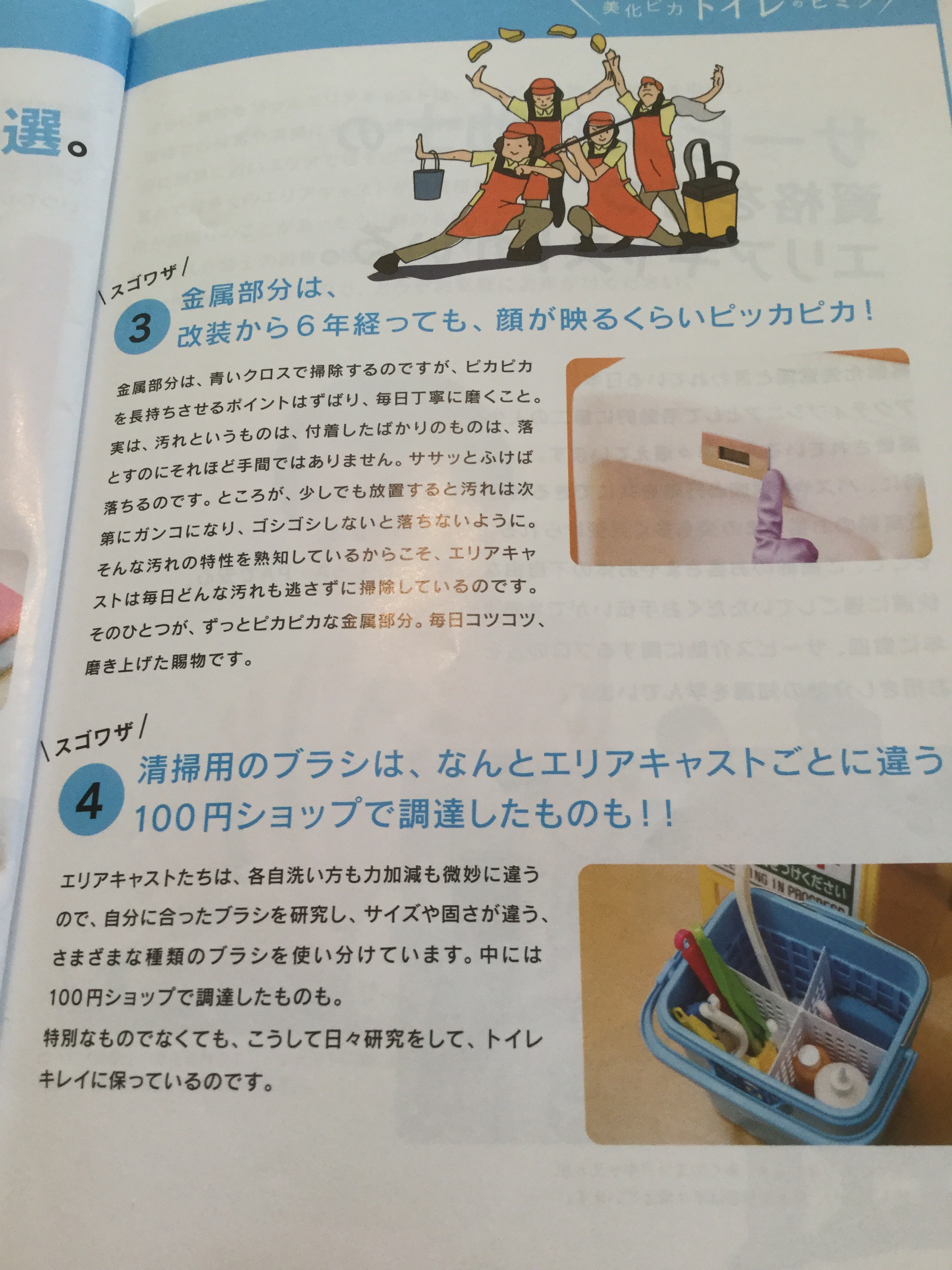 SAのトイレの清掃スタッフは、「エリアキャスト」と呼ばれ、トイレ掃除を隠す清掃から「魅せる清掃」にするために、女性のスタッフは綺麗でいるために、一流化粧品会社のメイクの研修も受ける。