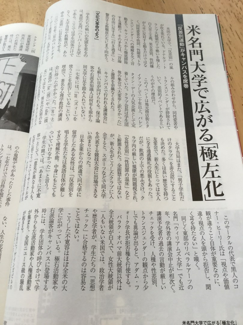 そういえば、『選択』(年間予約購読雑誌で市販されていない)の最新号1月号に、アメリカの名門大学の極左化がすすみ、女子学生からのデート・レイプの告発がすごいという記事が掲載されていた。