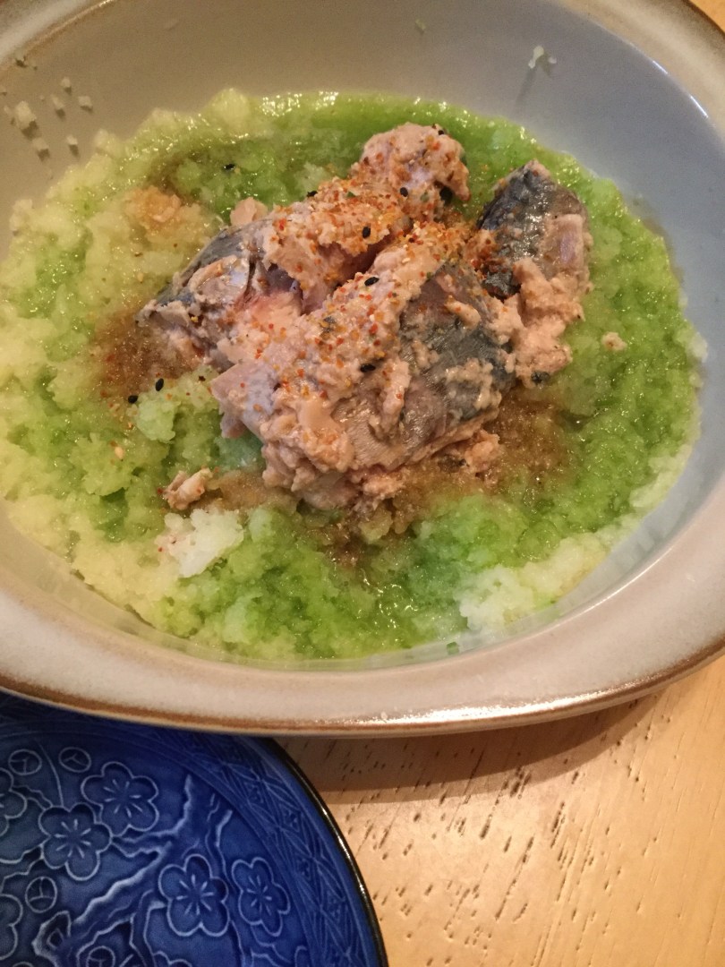 本日は、胃を休めるために夕食は、水煮缶の鯖とおろし大根に柚子唐辛子をかけて食す。