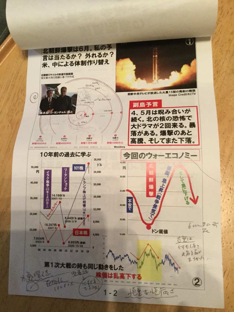 (1)米朝対談なんかしないだろう。あそこでやろう、ここでやろうとノラリクラリとトランプ大統領は言いつつ、やらん。北朝鮮爆撃は、アメリカの兵器産業の在庫整理のためにやるしかない。中国の習近平も瀋陽の人民軍が邪魔だから消耗させたい。