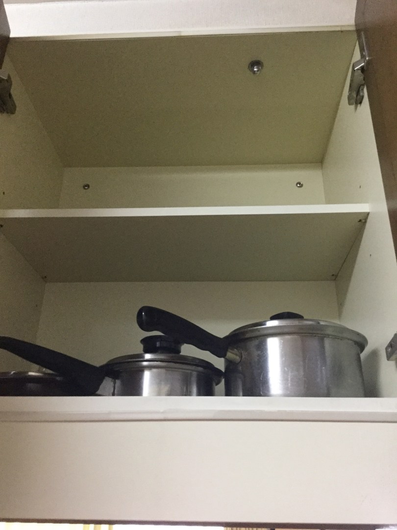 台所のシステムキッチン風の高い棚に入っていた重い鍋類や調理器を食器棚の最下段に入れた。