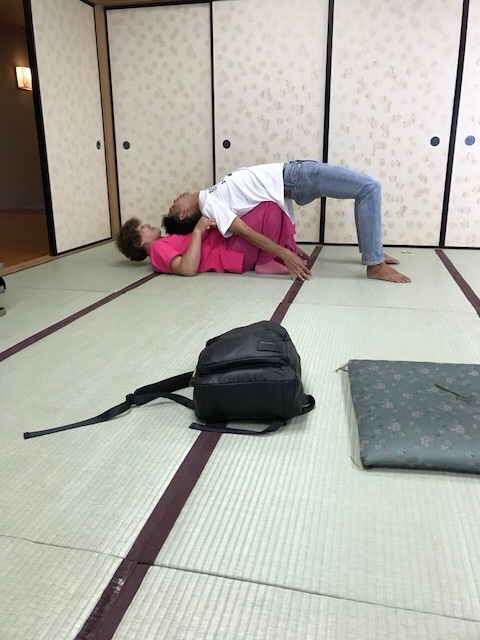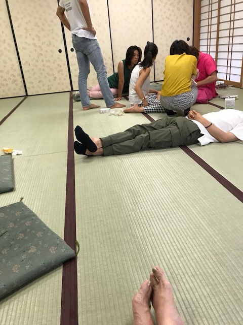 広い和室で、片や平井氏による赤ちゃんの舌はがしと整体があり、島氏による美容鍼と顎関節の歪み矯正セミナーもあり。