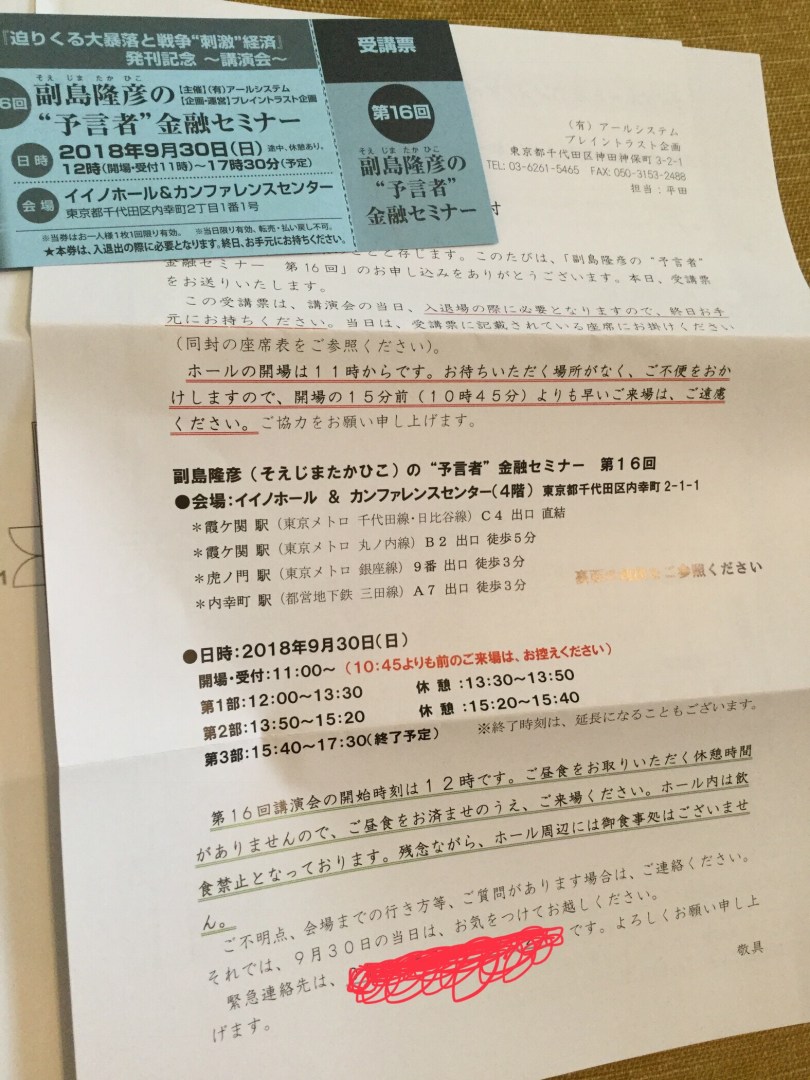 9月30日日曜日に東京は霞ヶ関というか虎ノ門付近の「イイノホール」4階で、正午から副島隆彦氏の「金融セミナー」第16回が開催される。