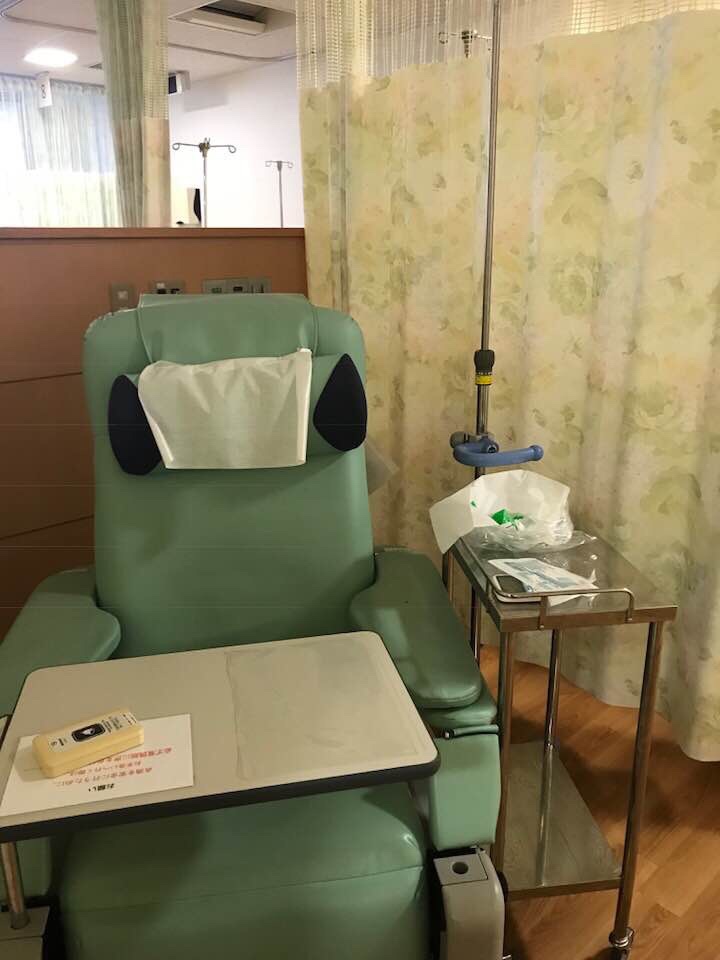 抗がん剤点滴は、ベッドで受ける患者さんもいれば、このようにリクライニングシートで受ける患者さんもいる。