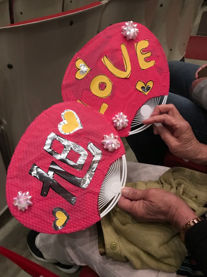 隣の座席の息子さん連れのご婦人は、応援うちわを作成してこられた。