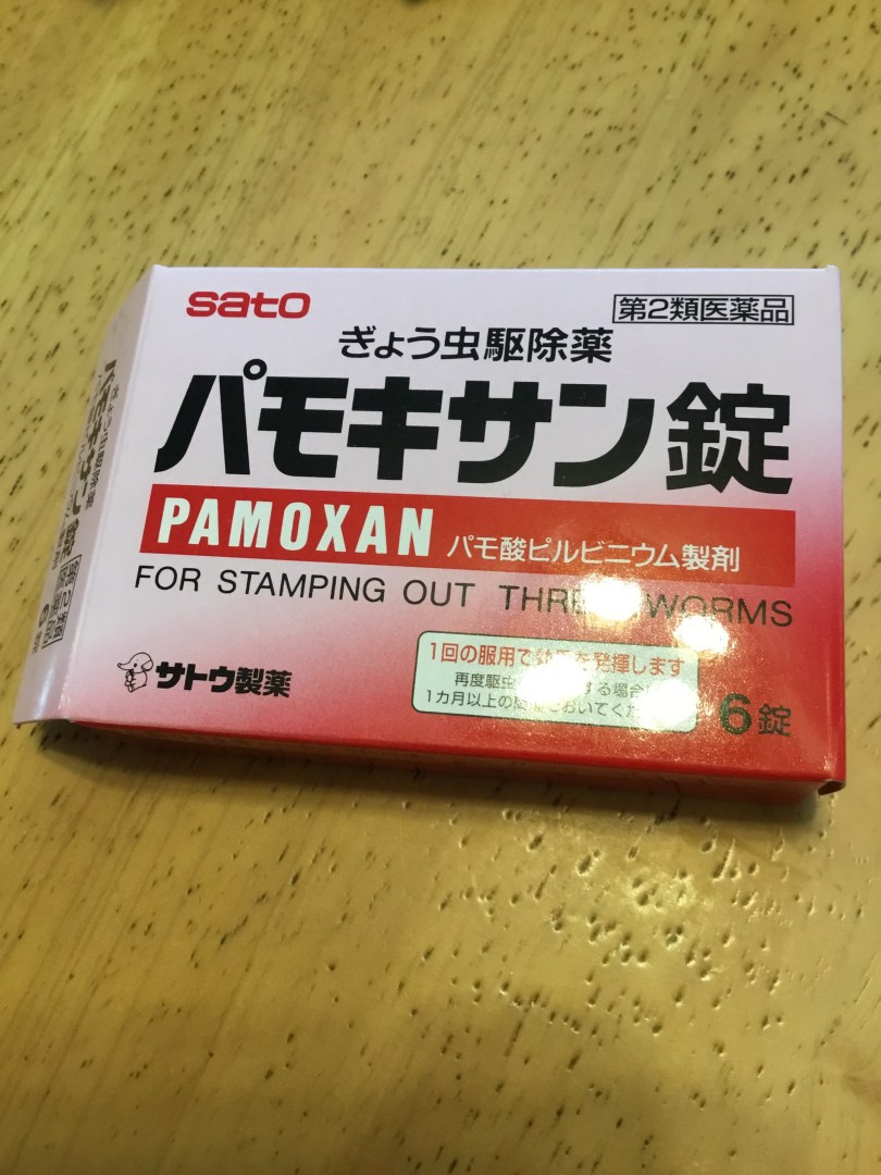 日本だと、入手しやすいギョウ虫駆除剤は、こういう薬。パモキサン。