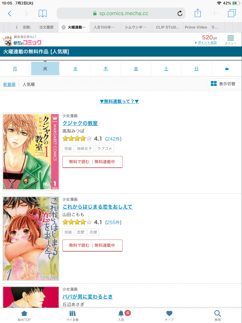 漫画については、紙媒体の漫画本は場所ふさぎになるので、もっぱら電子ブックを利用している。
