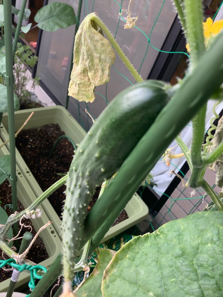 キュウリは私の水やりが足りなかったと判明。見て、このしおたれた葉っぱ。ごめんね〜〜キュウリさん。