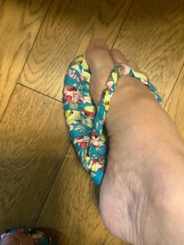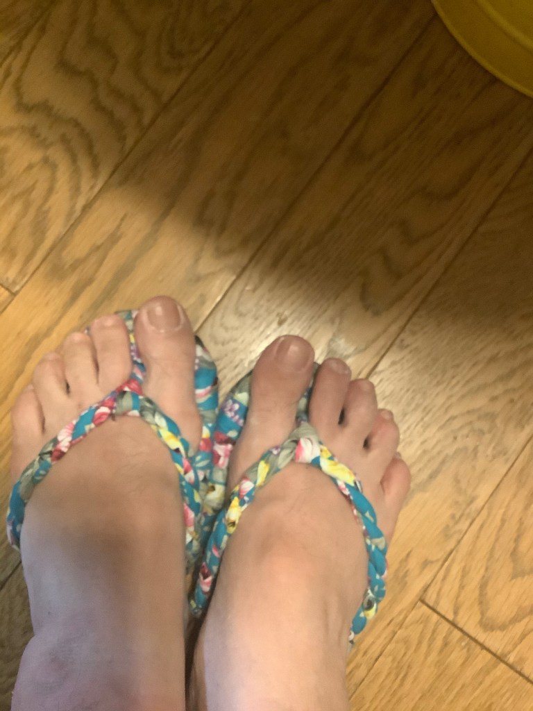 ペディキュアもしていない私の老けて踵も荒れた甲高の日本人足が非常にお見苦しいと思いますが、下は、私が自宅でスリッパの代わりに履いている足半の写真です。価格は3000円くらい。