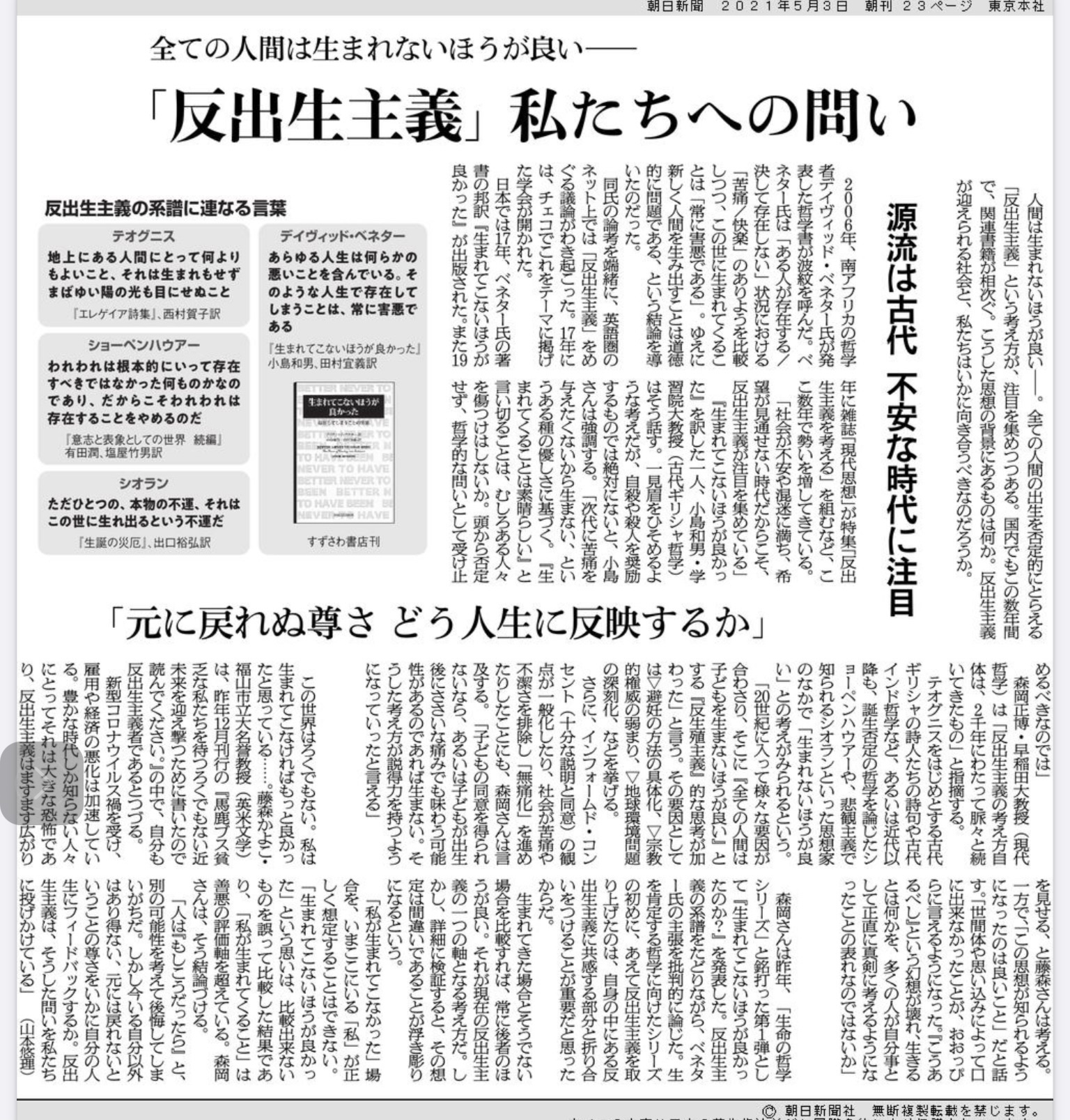 (1)5月3日憲法記念日には、朝日新聞朝刊の文化欄にちょっとだけ馬鹿ブス貧乏本の水色本が紹介されました。「反出生主義」に関する記事の一部に。