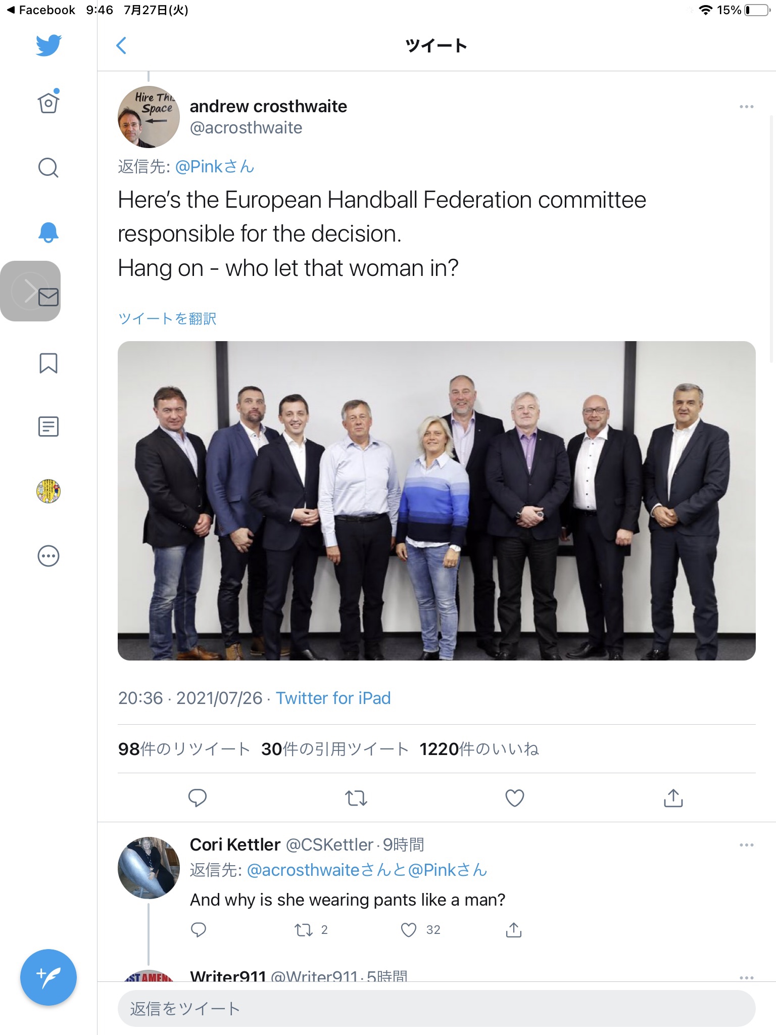 以下は、ハンドボールの女性選手はビキニ着用と言い募り、それが嫌でショートパンツを履く女性選手に20万円の罰金を私いる欧州ハンドボール連盟のメンバーたちだ。