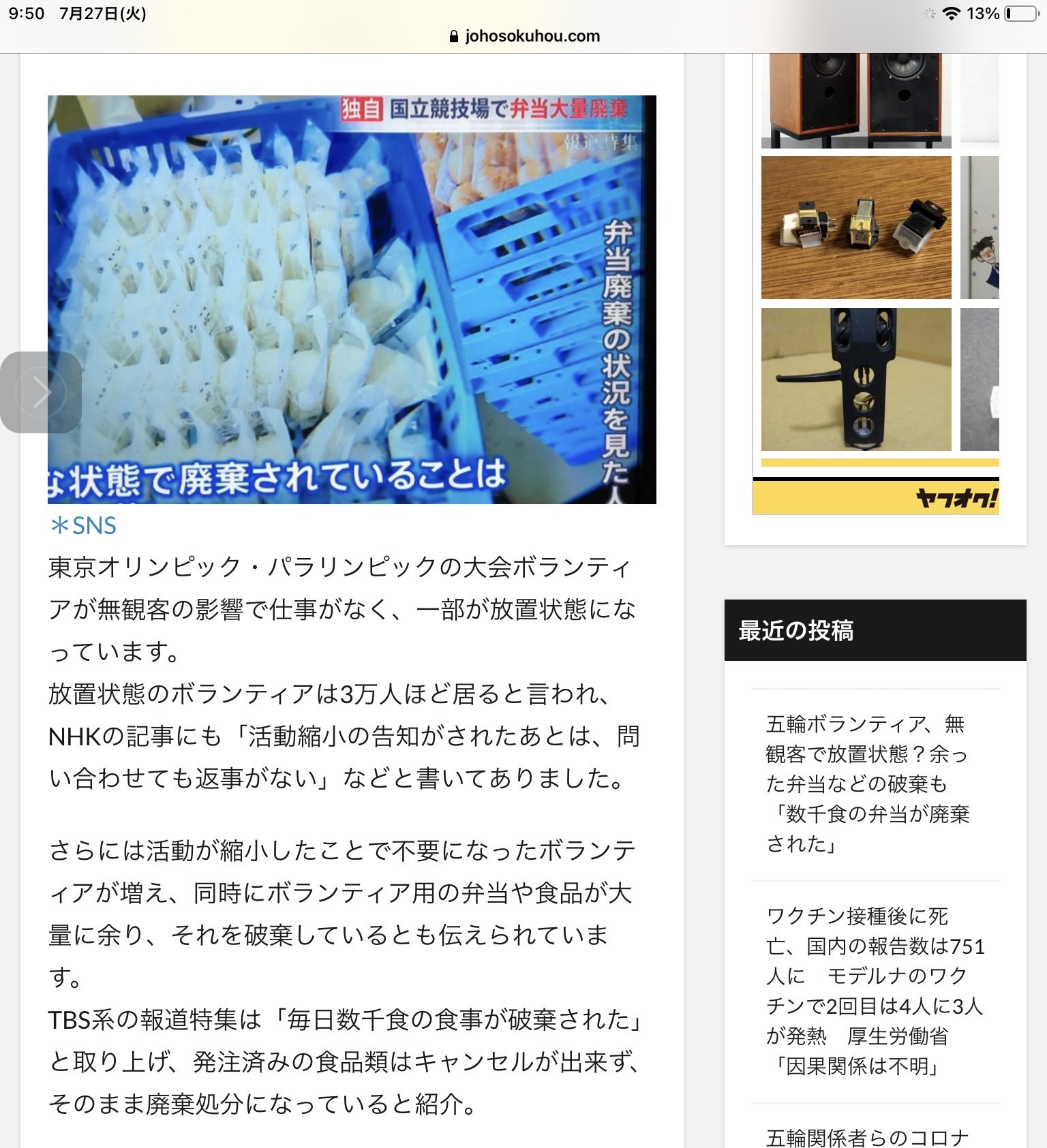 しかしさあ……競技場が無観客になったからヴォランティアが要らなくなって、お弁当が無用になったけど、弁当屋さんの収入は保障したいから、毎日お弁当を数千個ほど仕入れて、そのまんま破棄してるそうで。