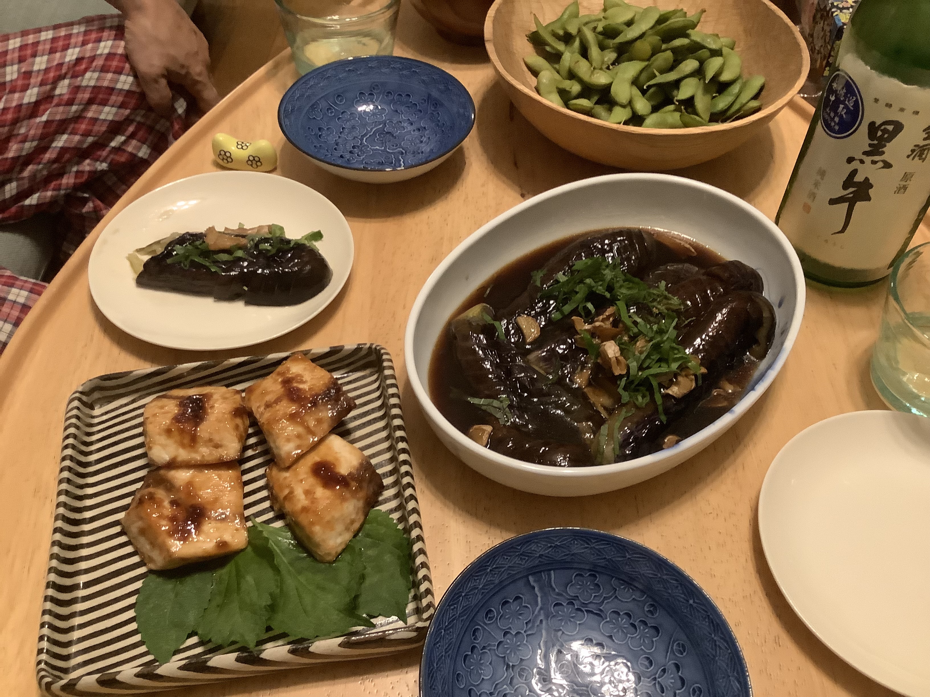夕食のメインは、茄子3本を半分に切っての煮浸し。