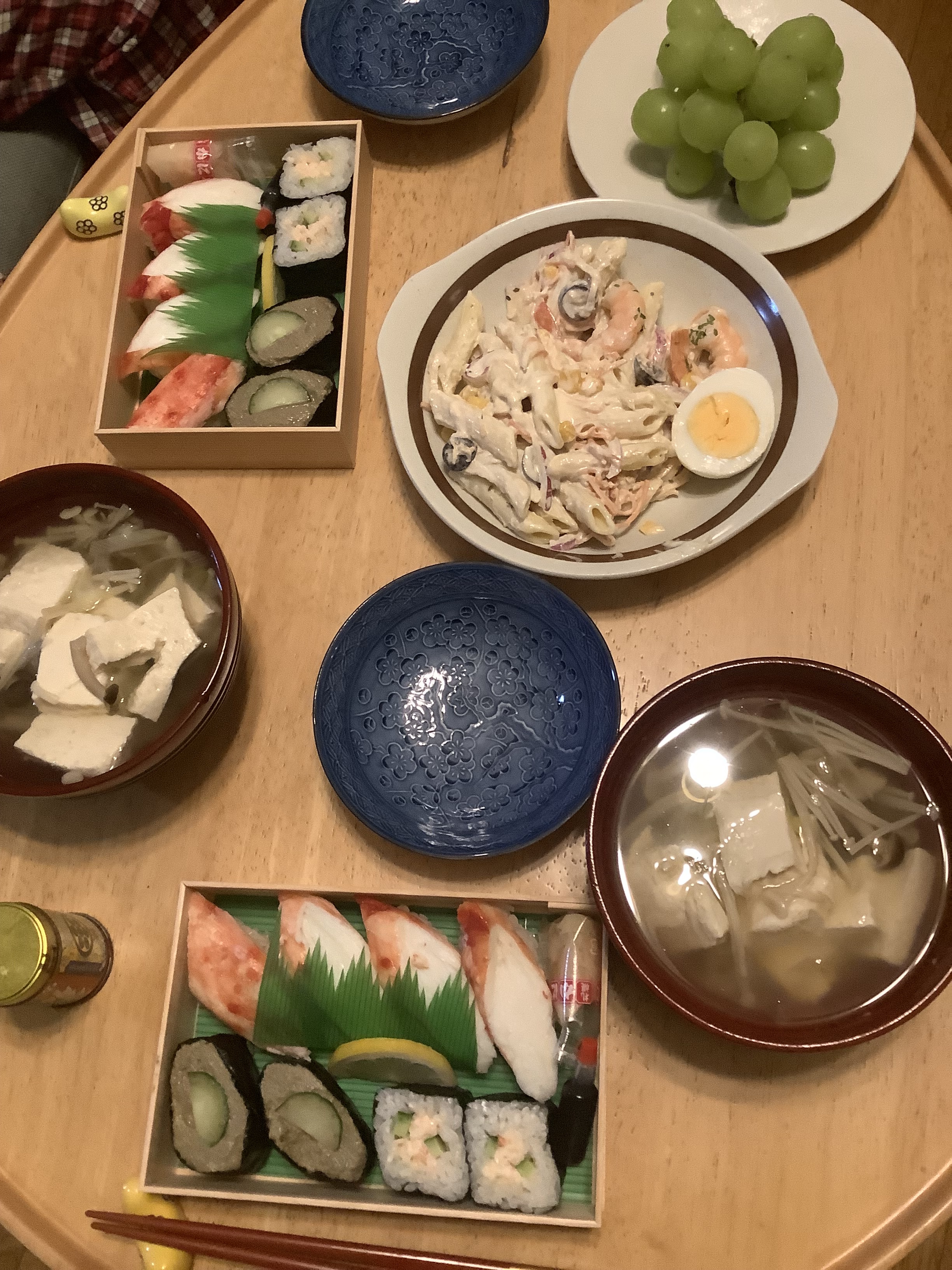 夕ご飯は、作る気力なく、夫にカニ寿司を買ってきてもらった。夫は、ついでにマカロニサラダと果物も買ってきてくれた。