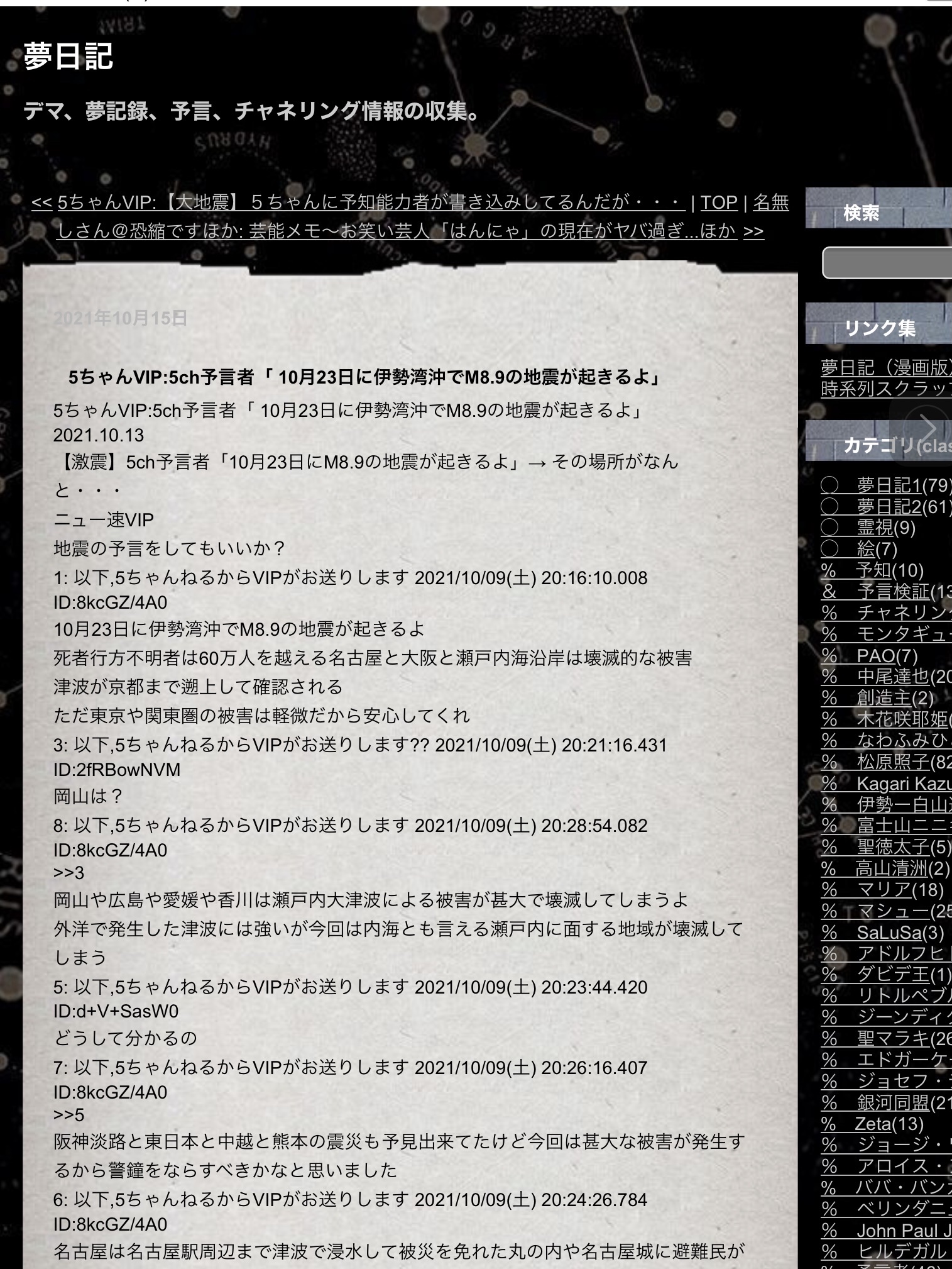 なんか、Facebook友だちに教えてもらったのですが、「5ちゃんねる」に、「10月23日に伊勢湾沖震源地マグニチュード8.9の大地震が起きる」という予言があったそうです。