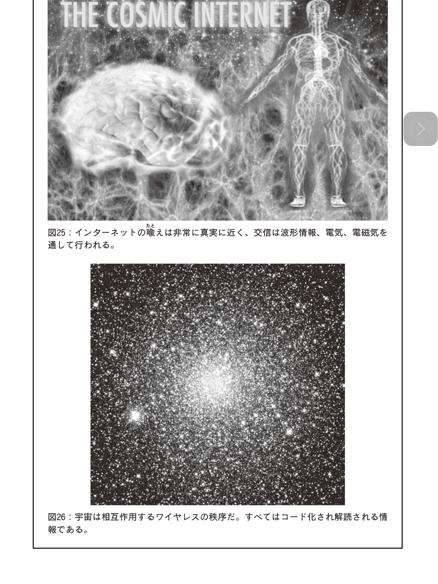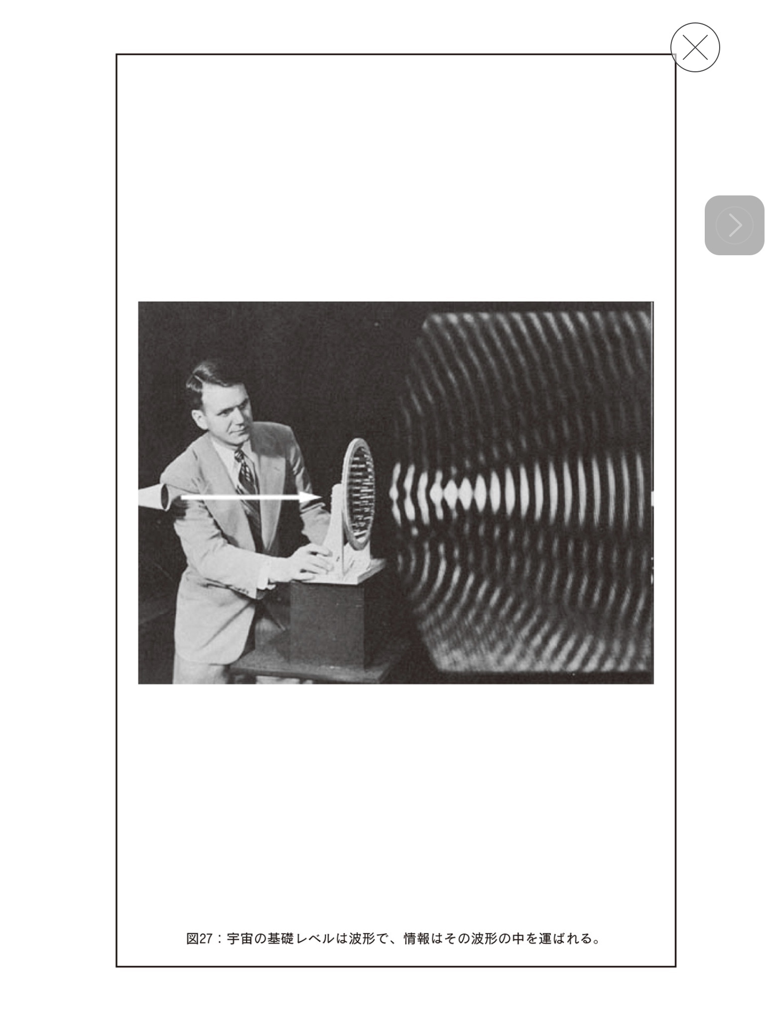 「この宇宙「 Wi-Fi」ないし波形情報場が宇宙の基礎であり、わたしたちが「見える」と思っている宇宙はこの情報場から解読される(その解読方法についてはあとで述べる)。宇宙をひと言でまとめるとすれば、それは「情報」」
