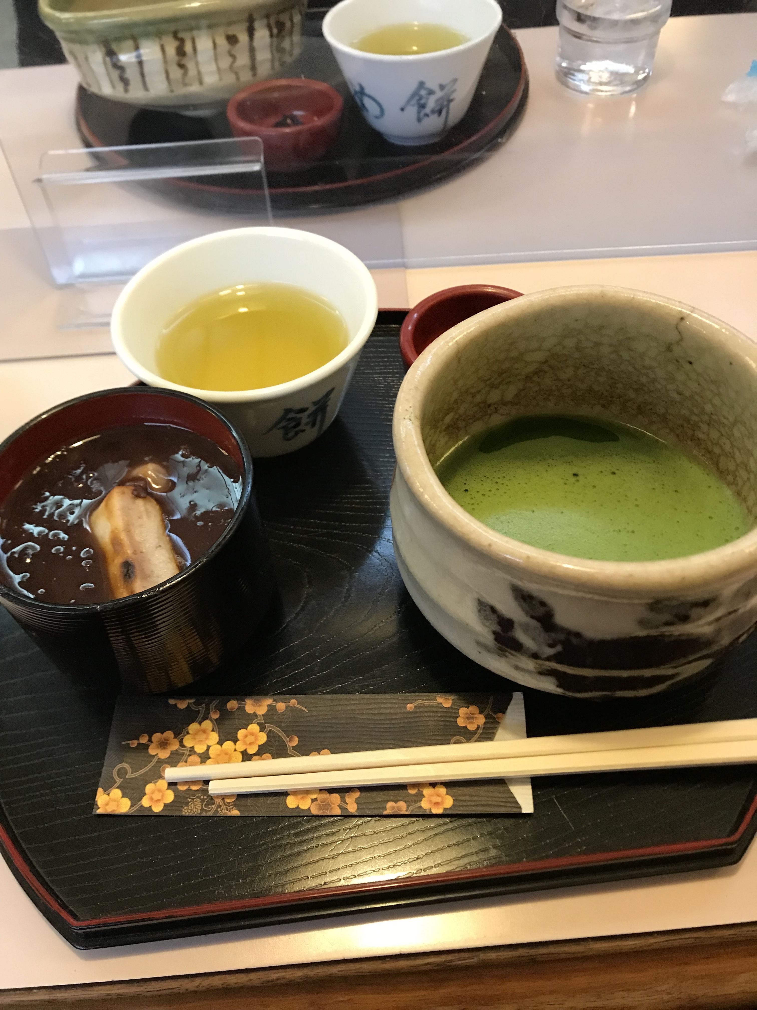 お抹茶400円。ぜんざい550円。スタバのコーヒーよりお抹茶が好きな古希寸前。
