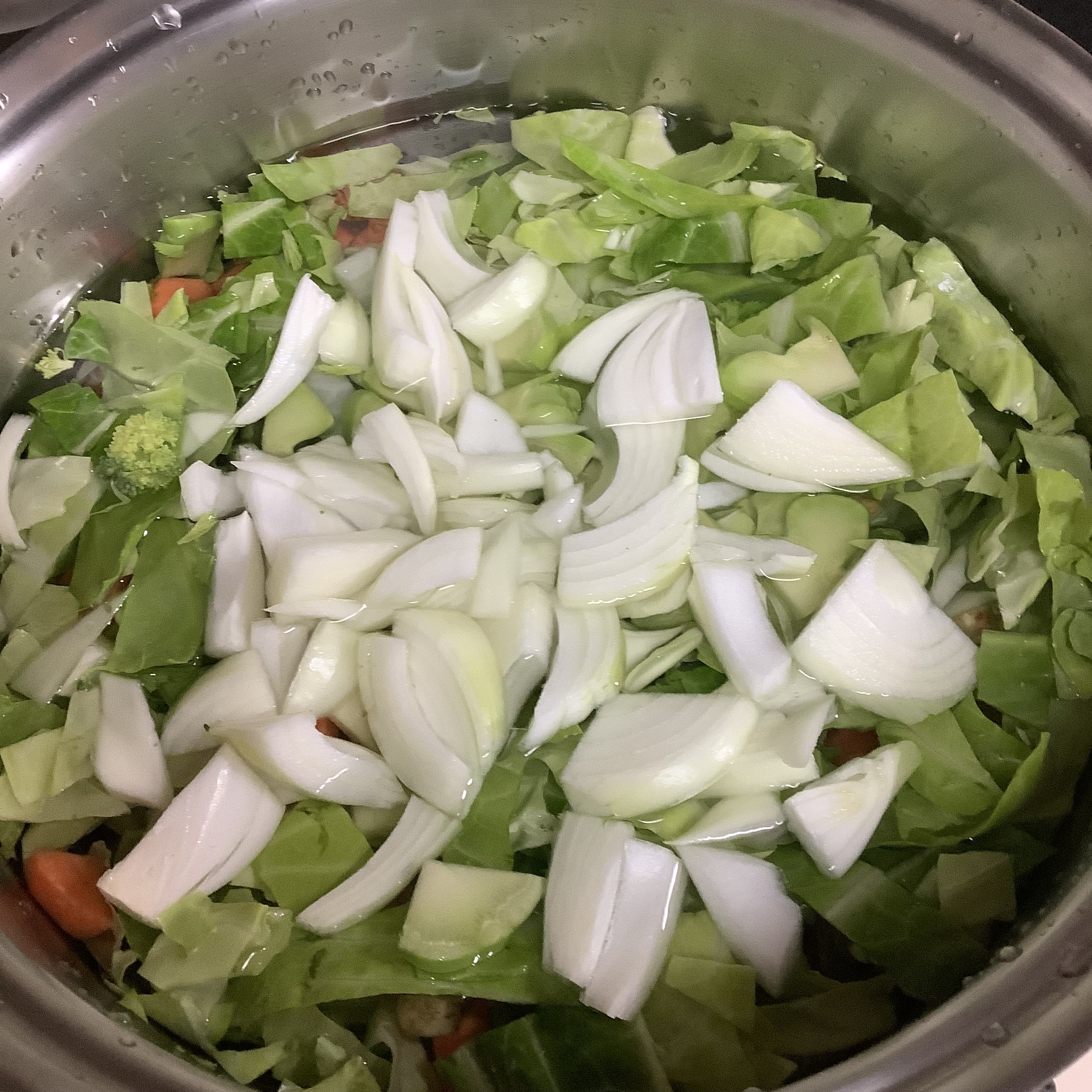 いっぱいの野菜を煮込んだ野菜だけスープよ。なんでもかんでも切り刻んでぶち込んで大量に作っておくのよ。冬なら4日間ぐらい冷蔵庫に入れなくても大丈夫だし。