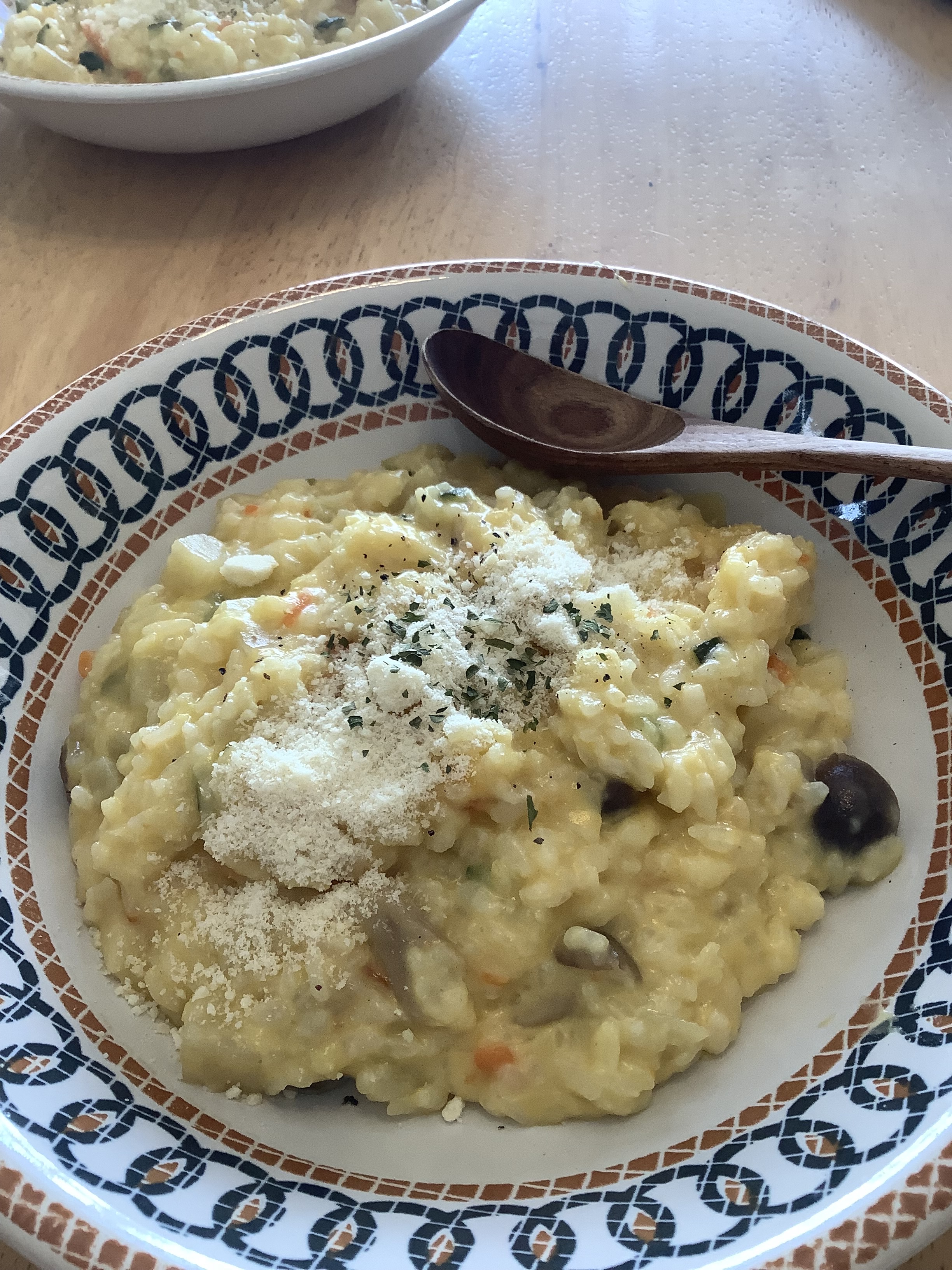 これは、しめじとかホワイトマッシュルームを、鍋に人数分だけ移した野菜だけスープに混ぜて煮込んで、そこに冷やご飯入れて、モッツアレラチーズのシュレッドも加えて煮込んで、粉チーズと乾燥パセリぶっかけて、できあがりよ。
