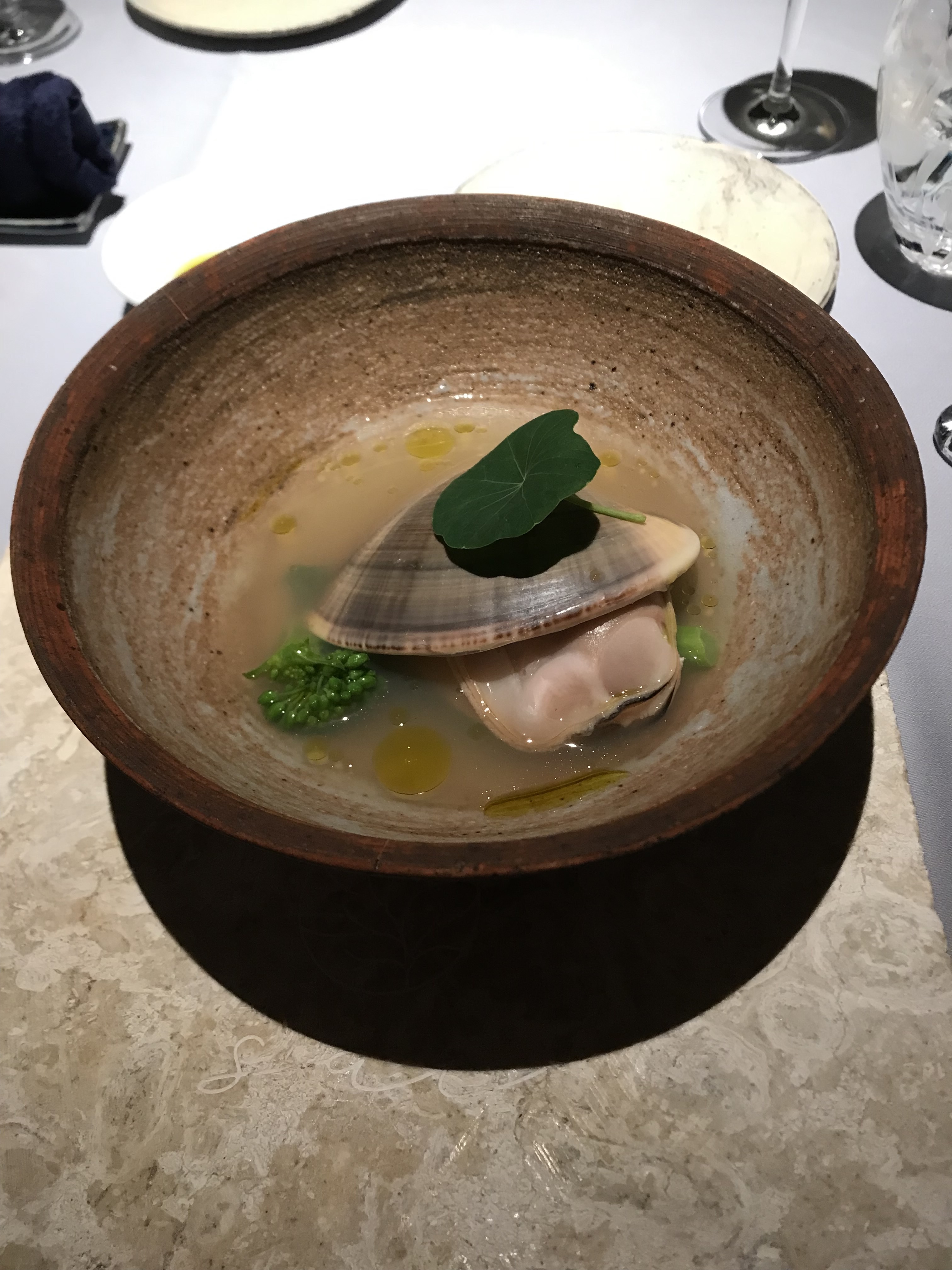 これが美味しい。蛤の旨味たっぷり。お野菜は菜花です。蛤の上の緑は……バジルの新芽だったっけ。違うな。忘れた。