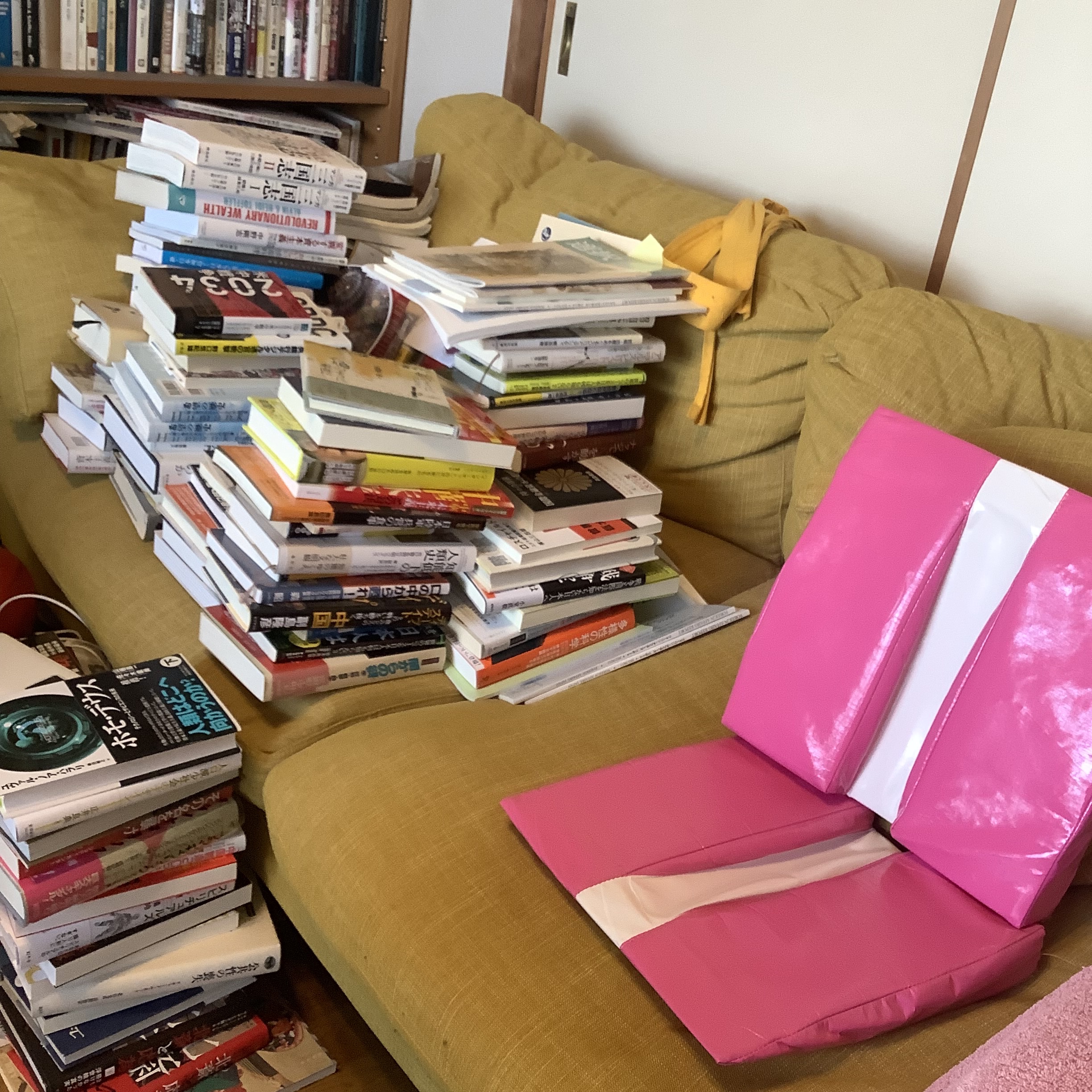 居間の私用のソファがこういう状態ですからねえ。これでも2箱分の書籍を処分したばかりなのですが。