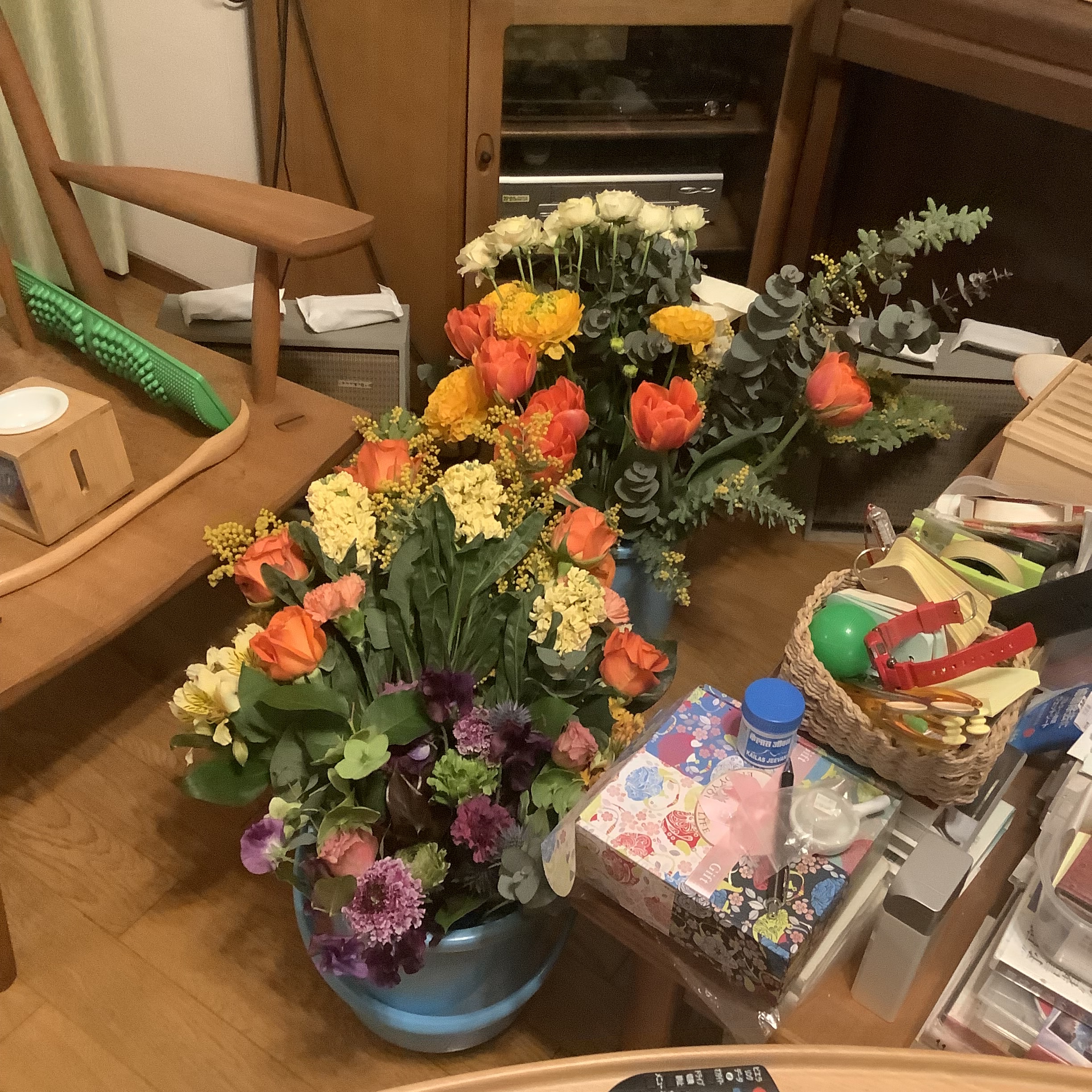 いただいたお花は花瓶に活けることができない分は、バケツに活けています。