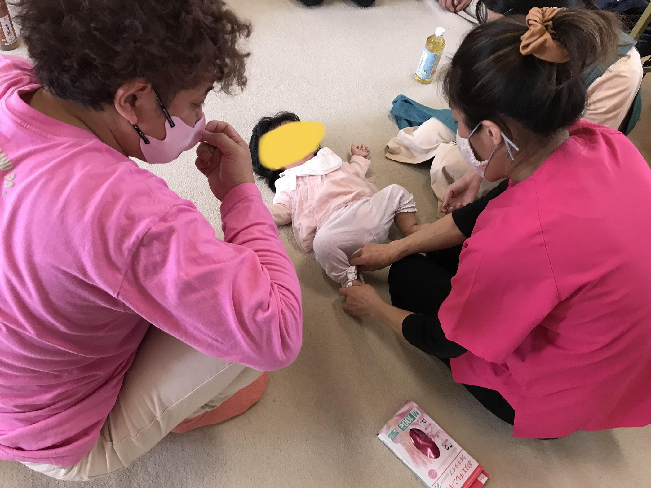 若いママさんにも、赤ちゃん整体を覚えていただく。赤ちゃんの身体を真っ直ぐに伸ばす。