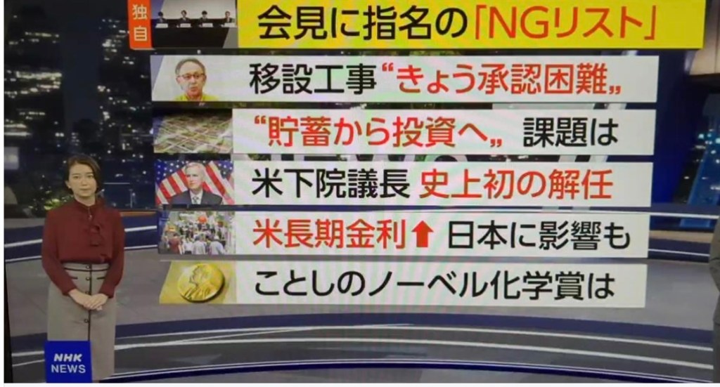 一昨日の10月4日の午後7時からのNHKのニュースの冒頭で、邪煮頭事務所の2回目の会見で、質問させてはいけない記者NGリストというものが、司会者に渡されていたということが報道された。