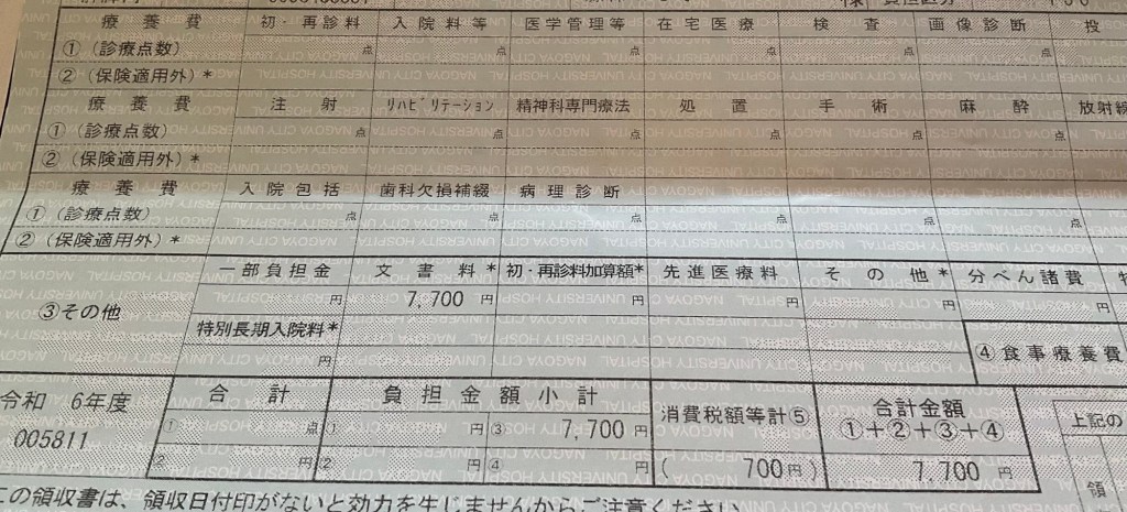 この領収書は、来年の確定申告の医療費控除とか、ガン保険会社に保険金請求とかで使うので、紛失してはいけません。