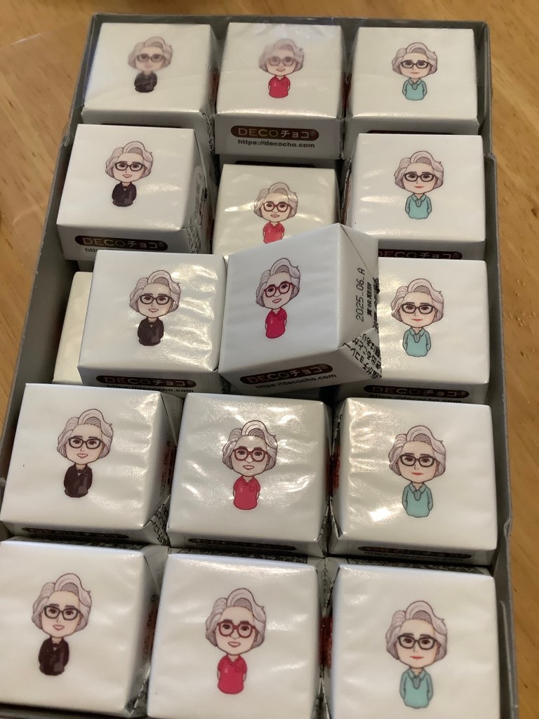 退院後に、退院のお祝いで、似顔絵のチロルチョコレートのセットを拝領しました。